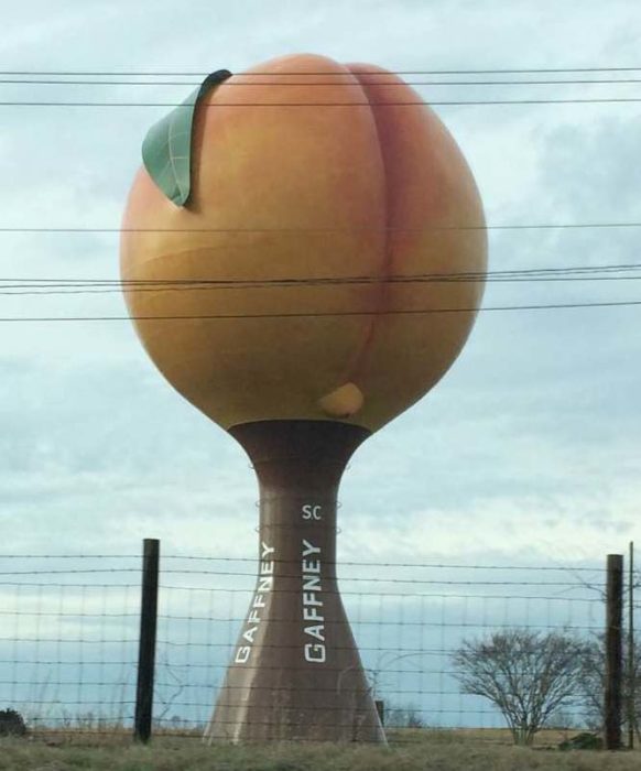 The weather people predicted rain for our travels, but the sun goddess waved her magic wand and instead we had a beautiful, crisp, clear, cool day. Once on the road we headed south and west past the lovely peach water tower. (I posted the pic on Facebook, but have re-posted it here in case you missed it. Feel free to share your thoughts. My favorite comment so far was “Trump’s salute to America”. But there were others!)